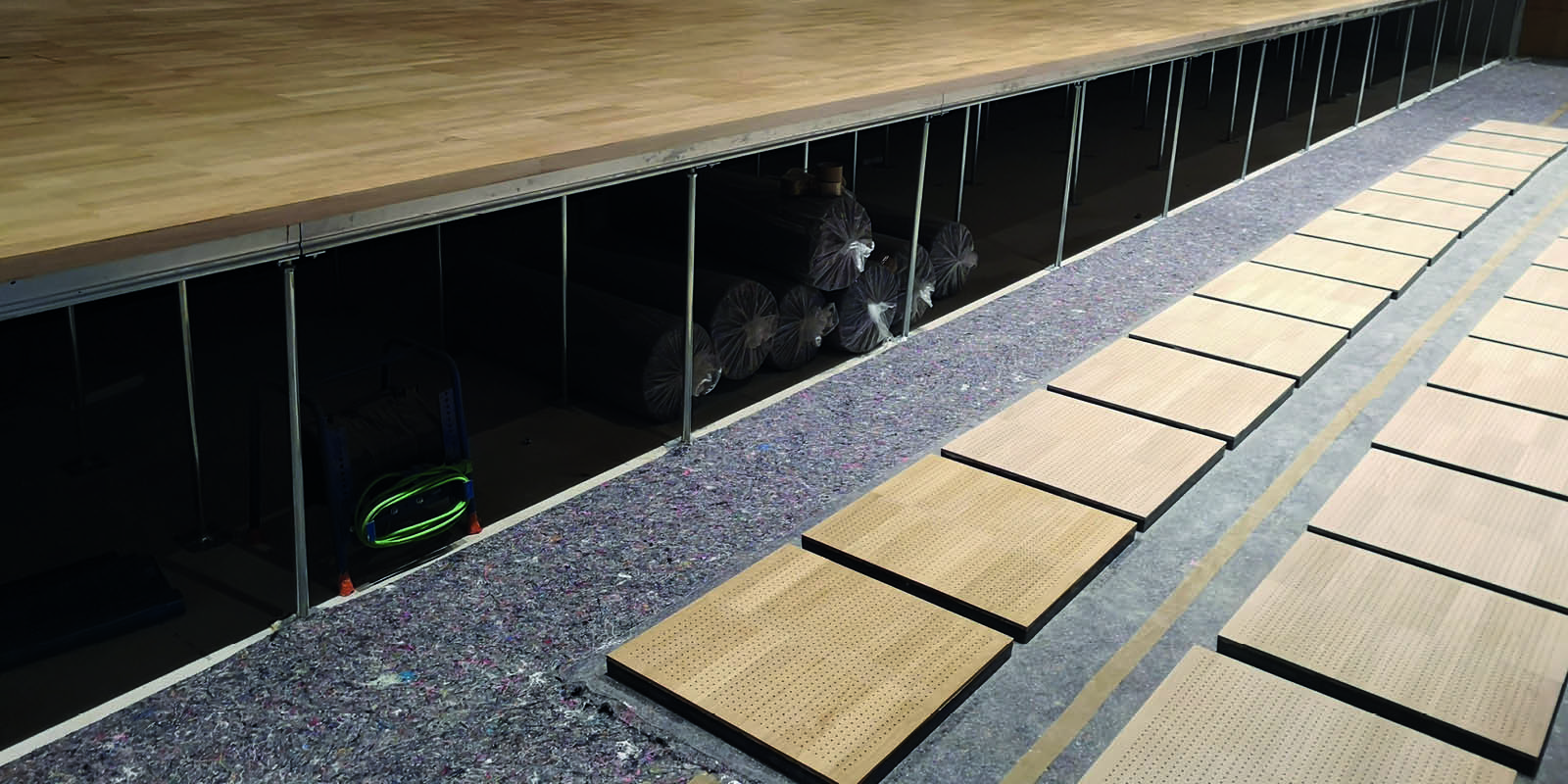 Es wurde ein Steigendes Gestühl mit einem Hohlbodensystem mit Lüftungsplatten geliefert und montiert. Es handelt sich hier um einen Druckboden. Nach der Hohlbodenmontage wurde mit der Fa. Wilms zusammen der Parkett aufgebracht und versiegelt.