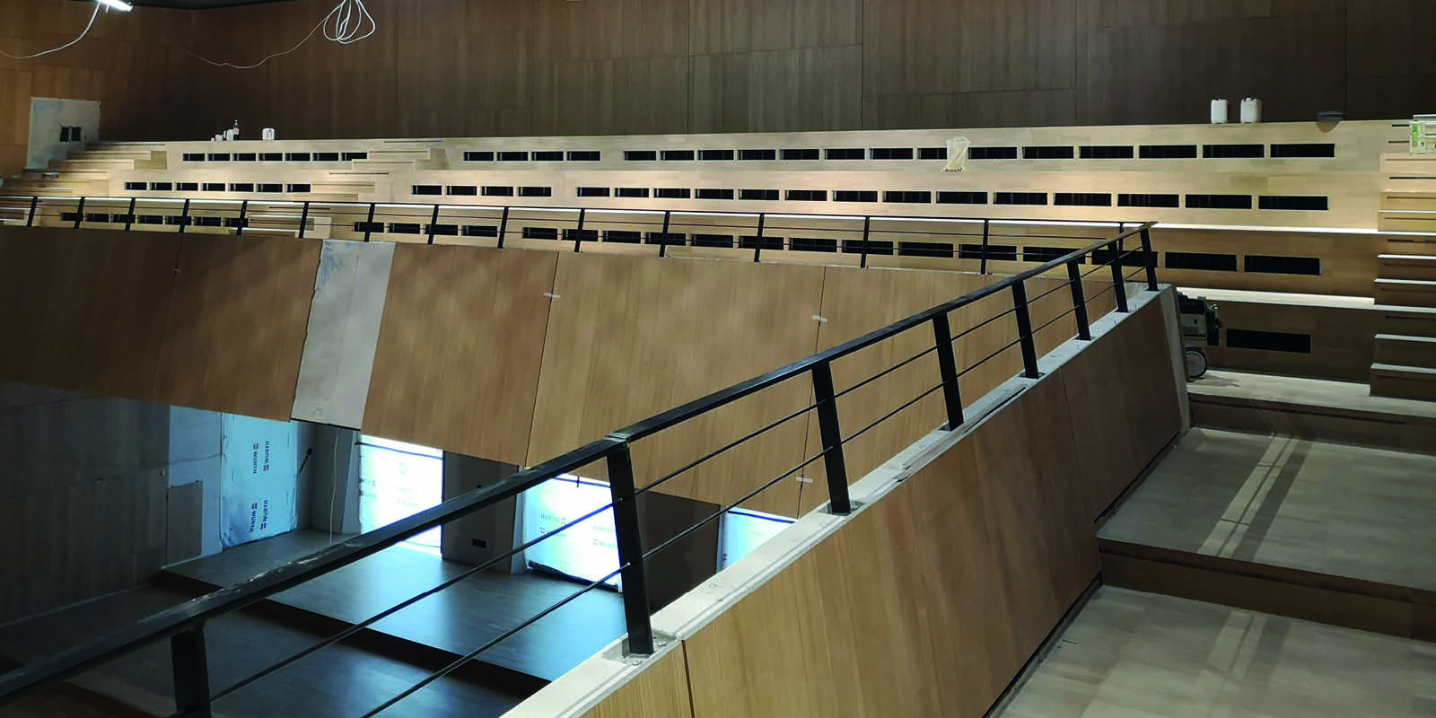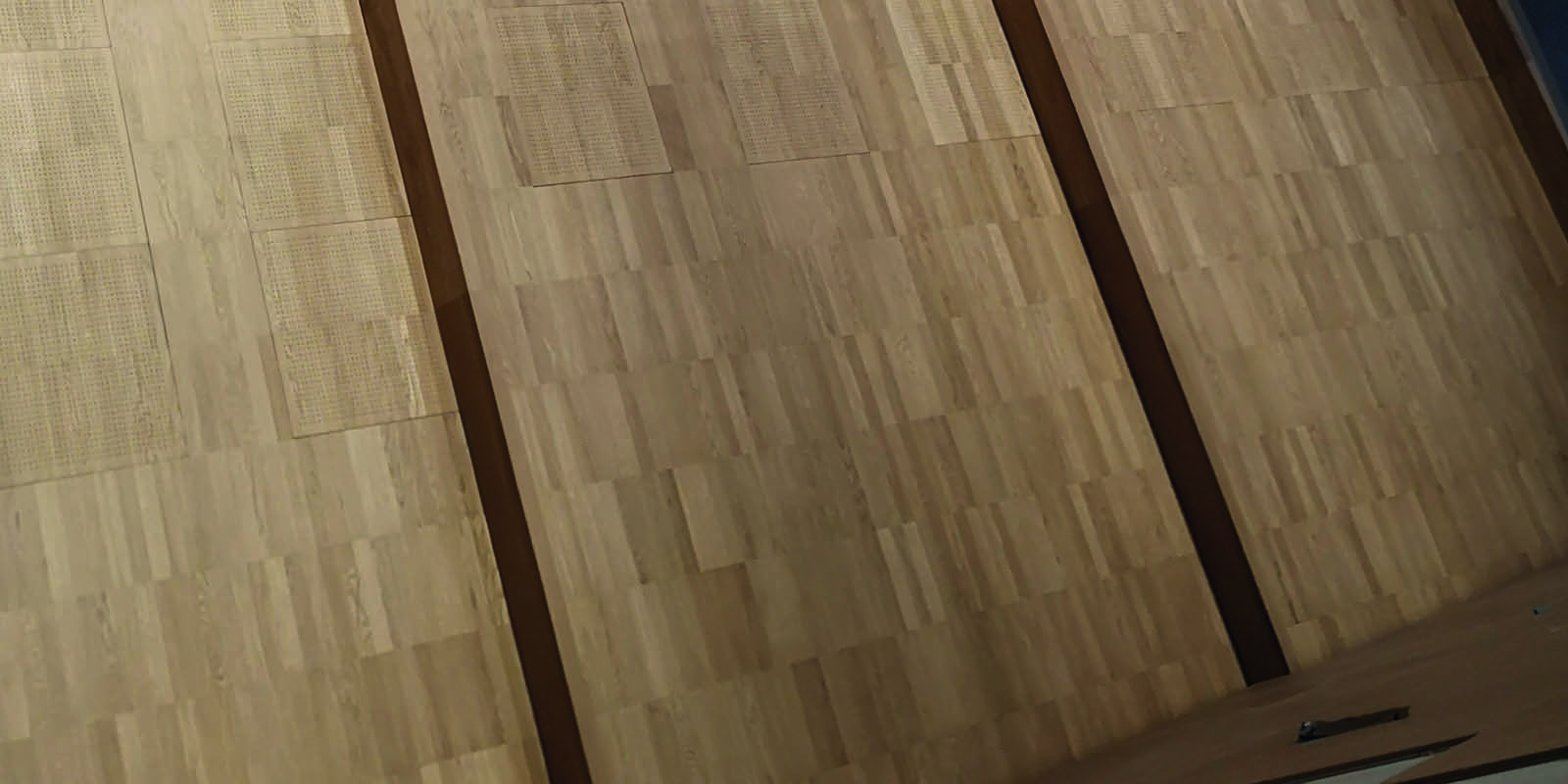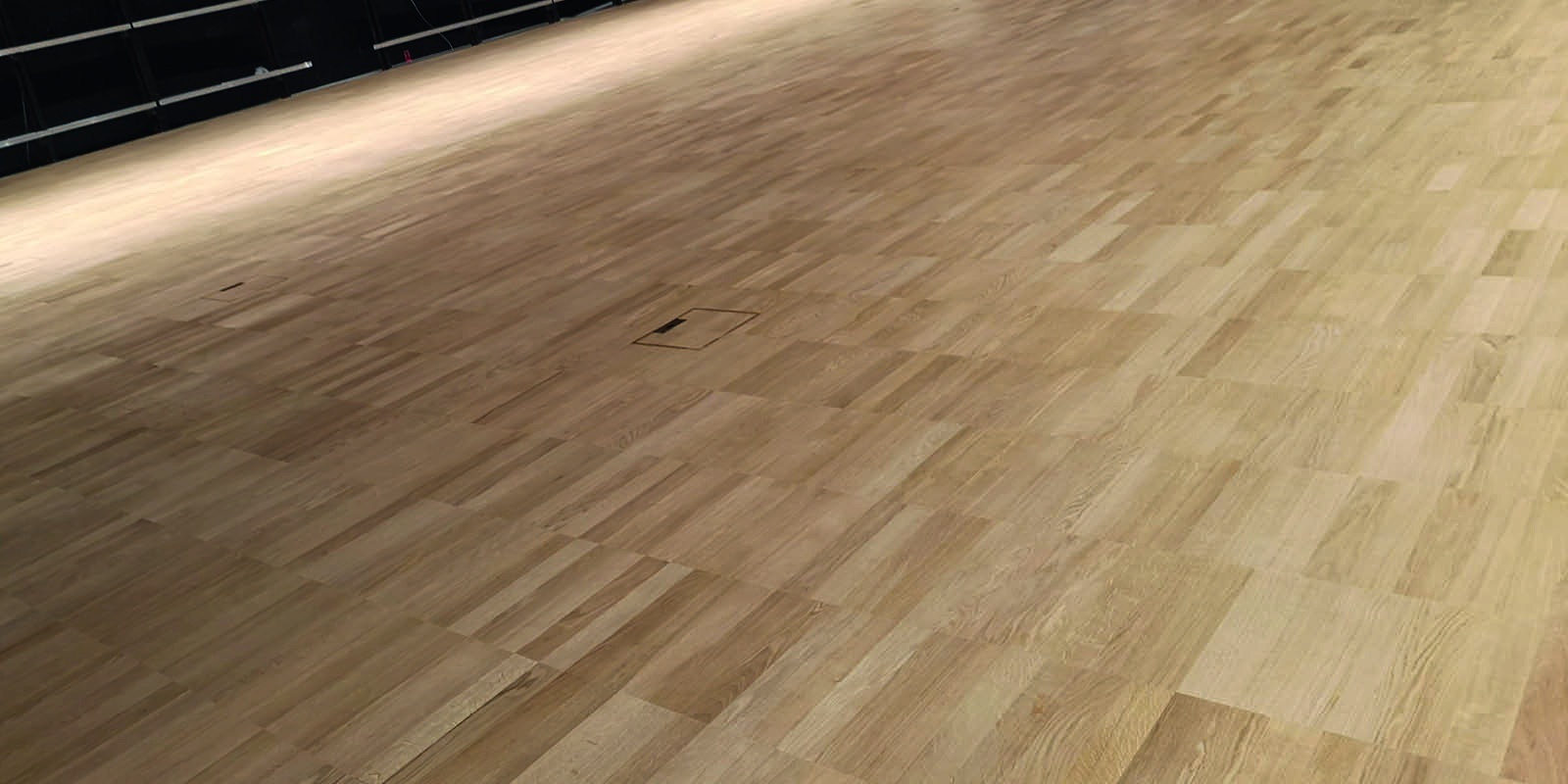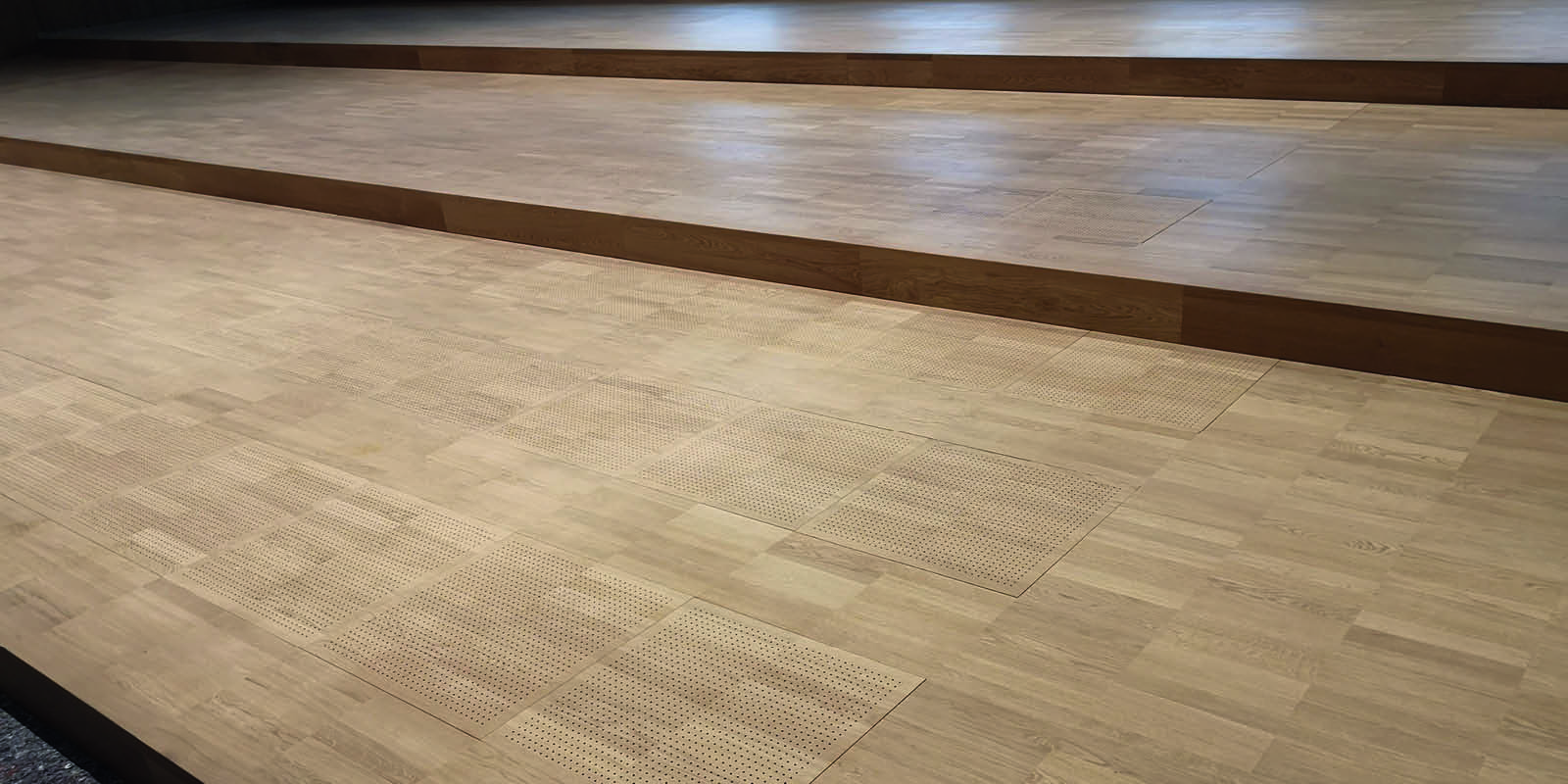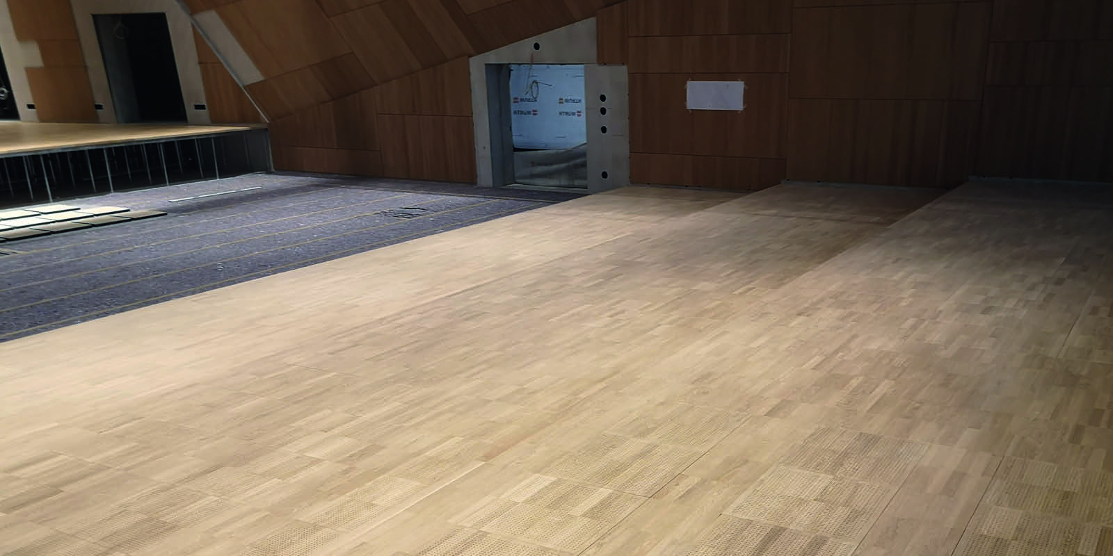 Es wurde ein Steigendes Gestühl mit einem Hohlbodensystem mit Lüftungsplatten geliefert und montiert. Es handelt sich hier um einen Druckboden. Nach der Hohlbodenmontage wurde mit der Fa. Wilms zusammen der Parkett aufgebracht und versiegelt.